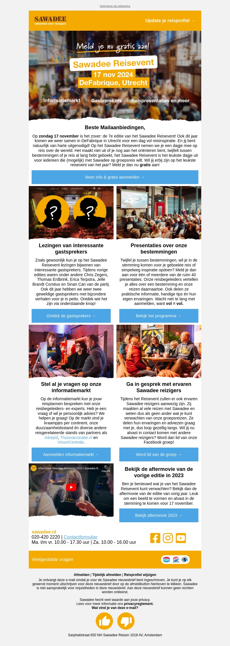 Beste Maileen, op zondag 17 november vindt de 7e editie van het Sawadee Reisevent plaats in DeFabrique, Utrecht. Bezoek lezingen van interessante gastsprekers, neem deel aan reisworkshops en informatiemarkten, en ga in gesprek met ervaren Sawadee reizigers. Mis het niet en meld je nu gratis aan!