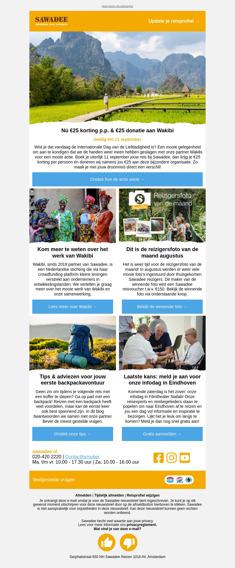 Ontvang €25 korting per persoon bij het boeken van je reis bij Sawadee voor 11 september. Daarnaast doneert Sawadee €25 namens jou aan Wakibi. Maak kennis met het werk van Wakibi, bekijk de reizigersfoto van de maand en krijg tips voor jouw backpackavontuur.