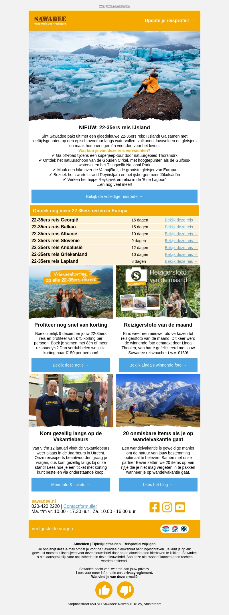 Sint Sawadee pakt uit met een gloednieuwe 22-35ers reis naar IJsland! Geniet van spectaculaire watervallen, vulkanen, en gletsjers. Duik in de geschiedenis en natuur van het land en verken populaire hotspots zoals de Blue Lagoon. Boek nu en ontvang kortingen op deze onvergetelijke ervaring!