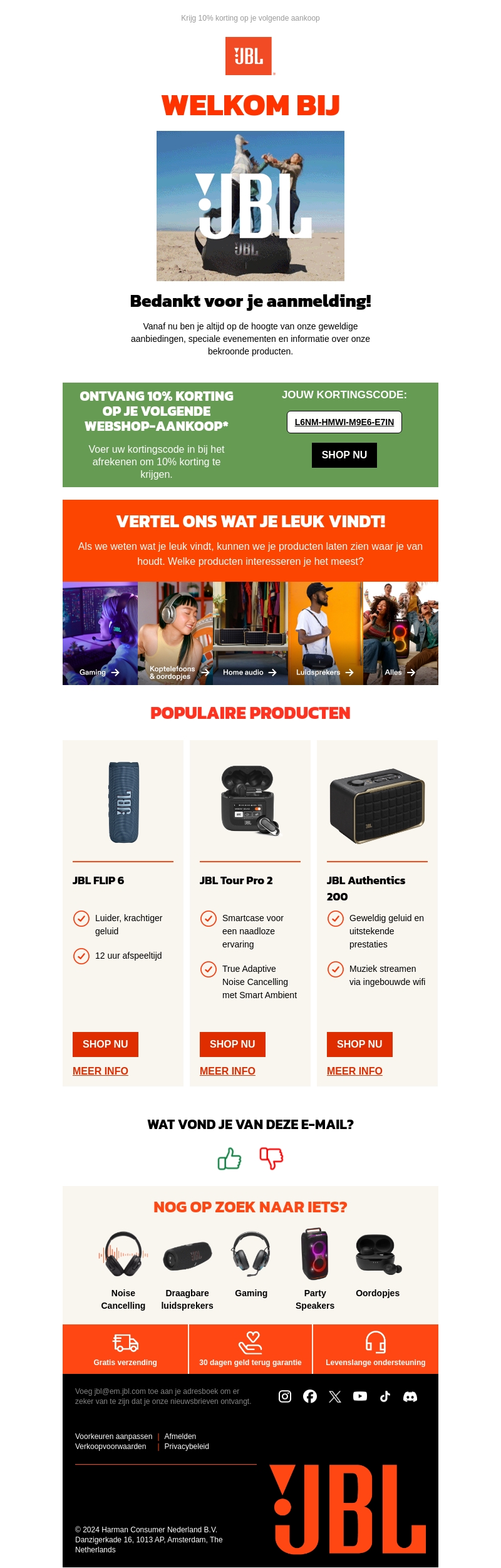 Bedankt voor je aanmelding bij JBL! Ontvang 10% korting op je volgende webshop-aankoop met de kortingscode, en ontdek de nieuwste producten zoals JBL Flip 6, JBL Tour Pro 2 en JBL Authentics 200. Laat ons weten wat je leuk vindt en blijf op de hoogte van onze beste aanbiedingen.