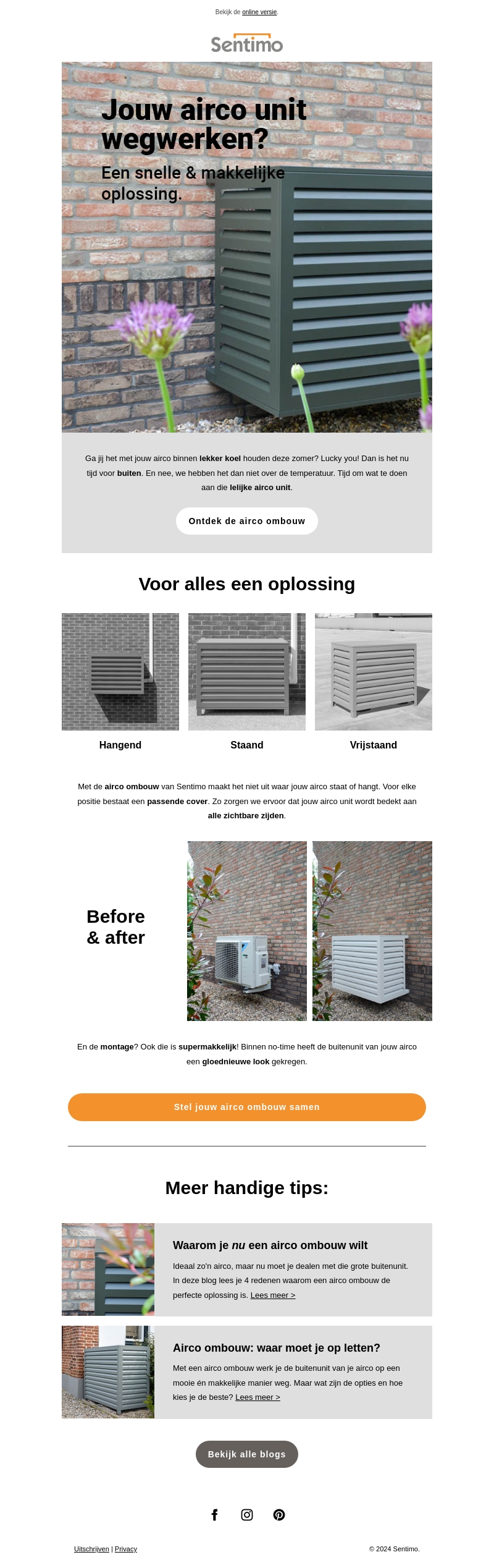 Wil je jouw airco unit buiten netjes wegwerken? Sentimo biedt diverse ombouw oplossingen die passen bij elke positie van de unit. Lees meer over de eenvoudige montage en de voordelen van een stijlvolle afwerking.