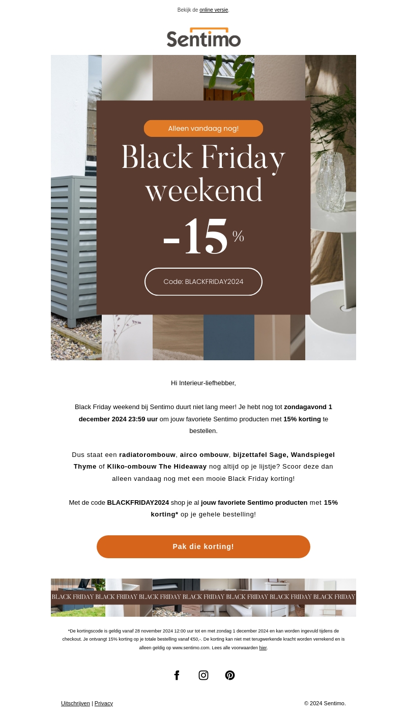 Grijp je kans tijdens het Sentimo Black Friday weekend en ontvang 15% korting op al je favoriete producten. Deze aanbieding geldt alleen tot en met zondagavond 1 december 2024. Mis het niet en bestel je radiatorombouw, airco ombouw of bijzettafel nu met korting. Gebruik de code BLACKFRIDAY2024 in de checkout voor deze exclusieve deal.