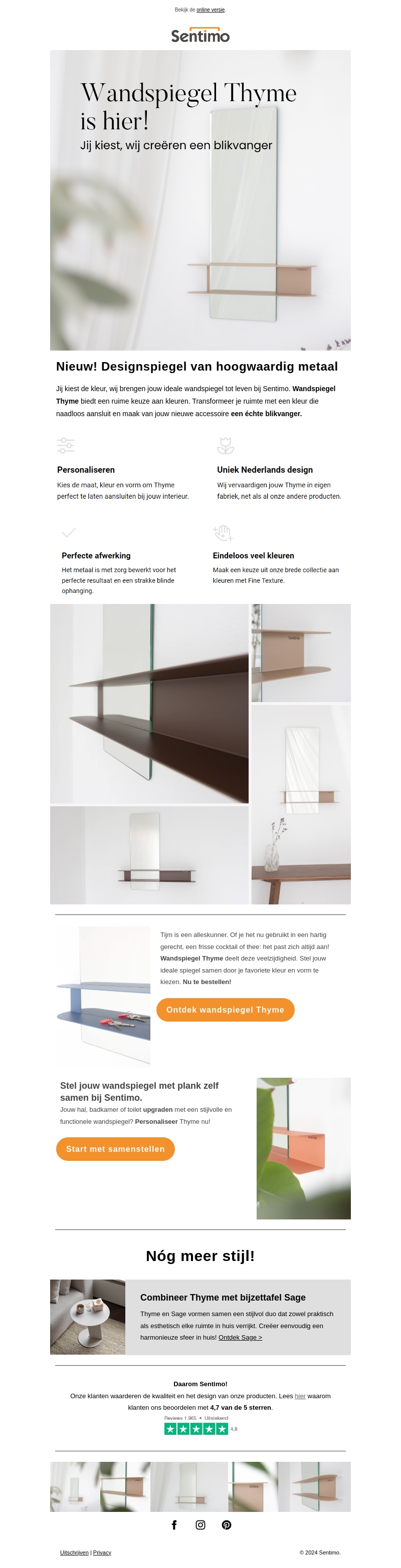 De nieuwe Wandspiegel Thyme van Sentimo is gearriveerd. Personaliseer je interieur met deze veelzijdige spiegel beschikbaar in diverse kleuren en formaten. Gemaakt van hoogwaardig metaal, biedt het een perfecte afwerking en uniek Nederlands design. Combineer Thyme met bijzettafel Sage voor een complete look. Bestel vandaag nog en transformeer je ruimte.