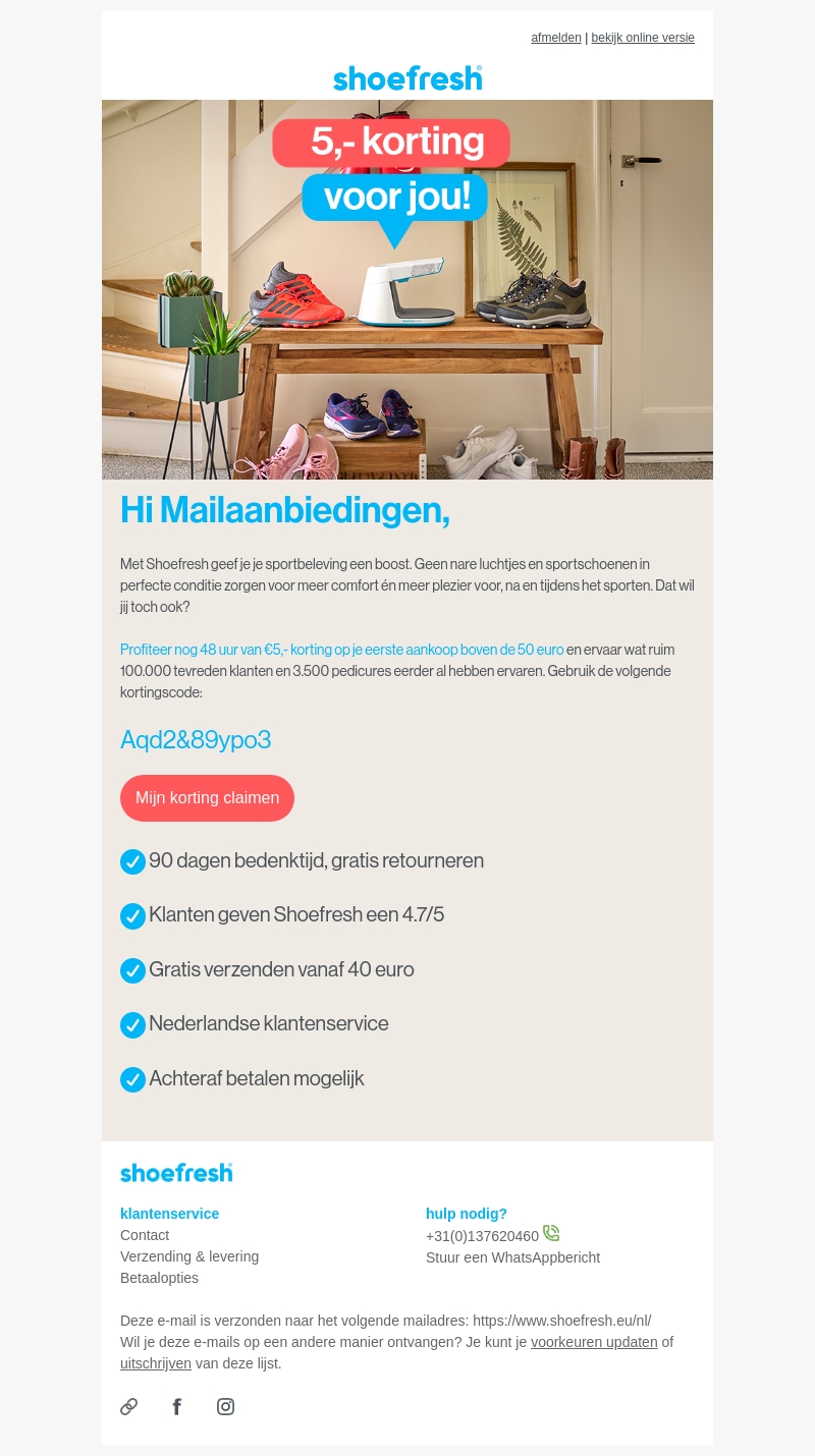 Met Shoefresh geef je je sportbeleving een boost. Geen nare luchtjes en sportschoenen in perfecte conditie zorgen voor meer comfort én meer plezier voor, na en tijdens het sporten. Profiteer nog 48 uur van €5,- korting op je eerste aankoop boven de €50 euro. Gebruik de kortingscode: Aqd2&89ypo3.