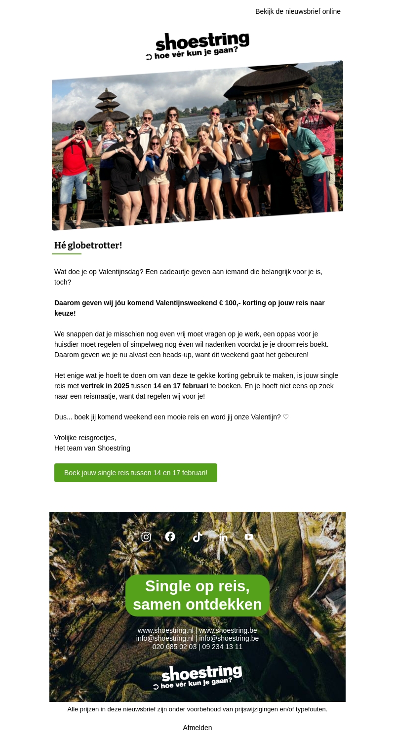 Waar ga jij heen deze Valentijnsdag? Bij Shoestring krijg je nu €100 korting op je reis tussen 14 en 17 februari. Perfect voor een romantisch uitje of avontuurlijke ontsnapping. Boek jouw single reis en ontdek samen met anderen nieuwe bestemmingen.