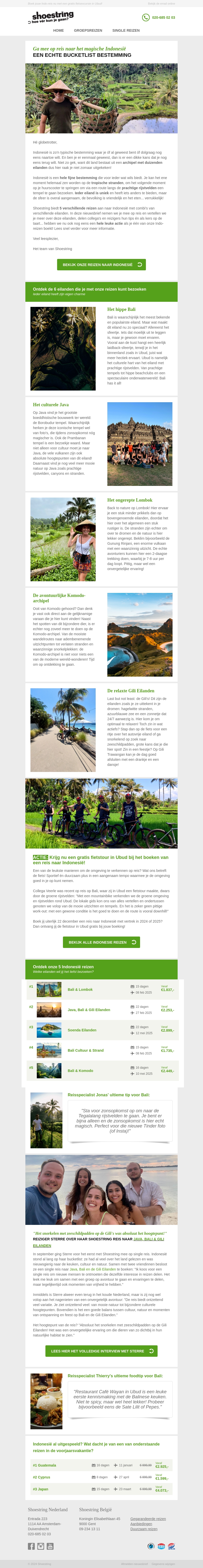 Ervaar de diverse schoonheid van Indonesië met Shoestring. Verken het natuurlijke wonder van Java, de rustieke charme van Lombok en de unieke fauna van Komodo. Kies een reis die bij je past met onze boeiende aanbiedingen en start je avontuur naar een onvergetelijke bestemming.