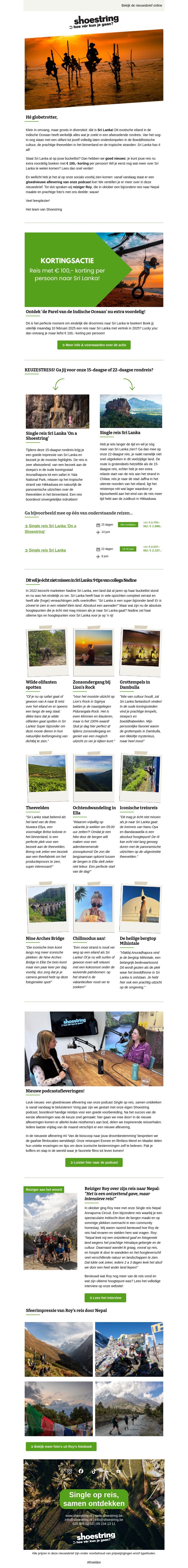 Ontdek de schoonheid van Sri Lanka met onze exclusieve kortingsactie. Geniet van prachtige stranden, rijke cultuur en heerlijke gerechten. Deze nieuwsbrief biedt een speciale korting voor reizigers die op zoek zijn naar avontuur en ontspanning. Boek nu en profiteer van een unieke reiservaring in de parel van de Indische Oceaan.