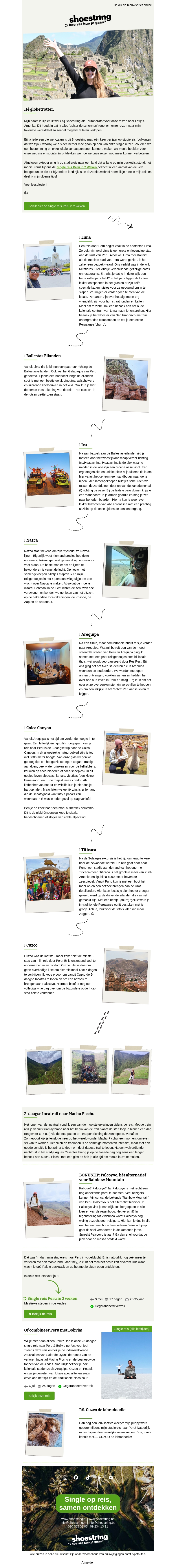 Reis met Ilja naar Peru en ontdek de ultieme tips en must-do's in dit prachtige land. Leer over lokale cultuur, culinaire avonturen en de natuurlijke wonderen die op je wachten. Of je nu geïnteresseerd bent in avontuur of ontspanning, deze nieuwsbrief biedt inspiratie voor elke reiziger.