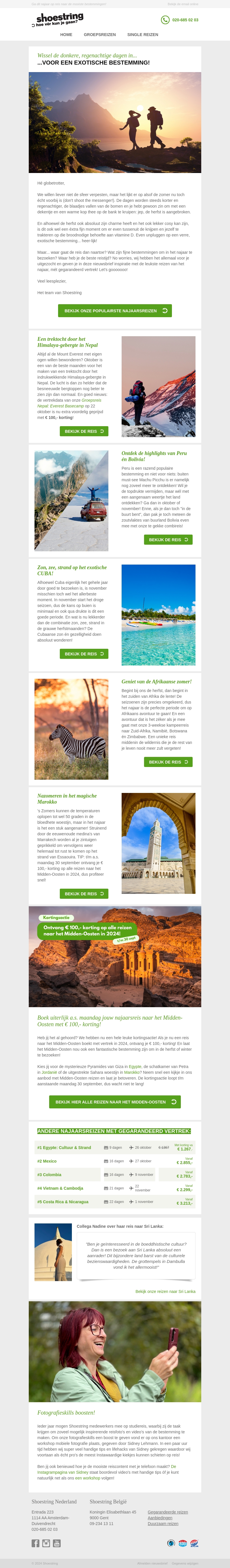 Laat de grijze dagen achter je en reis af naar exotische bestemmingen. Deze nieuwsbrief biedt je de mogelijkheid om geweldige plekken te ontdekken en te genieten van speciale kortingen. Of je nu de warmte van Cuba wilt voelen of de stijl van Marokko wilt ervaren, wij hebben de perfecte reis voor jou.