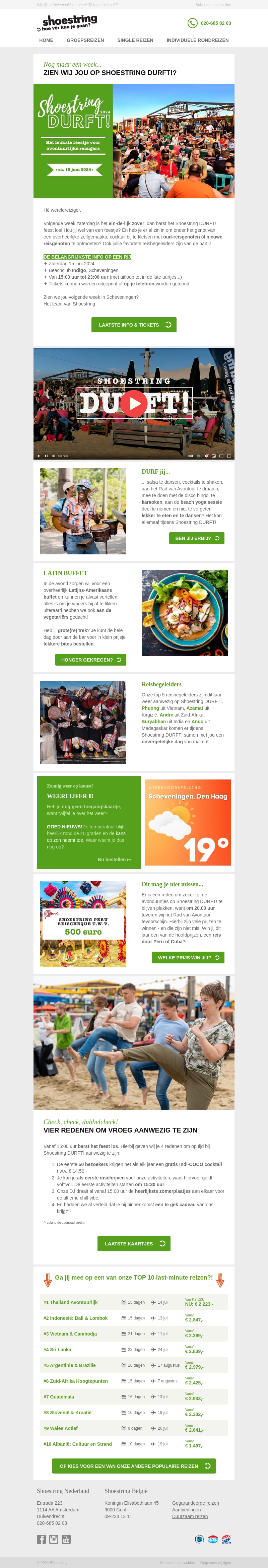 Volgende week zaterdag is het eindelijk zover! Geniet van een dag vol muziek, workshops, exotisch eten en cocktails aan het strand tijdens Shoestring DURFT! Mis het niet en zorg dat je erbij bent in Scheveningen. Bestel nu je tickets en kom mee feesten!