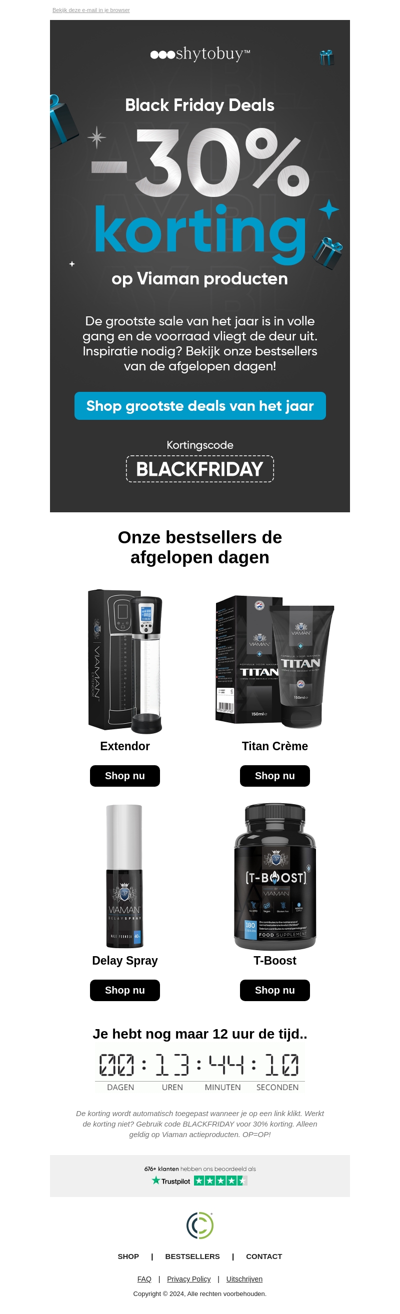 Mis deze mega-Black Friday deals niet. Geniet van 30% korting op Viaman producten. Bekijk onze populairste items zoals Extendor en Titan Crème. Gebruik de kortingscode BLACKFRIDAY voor extra kortingen. Wacht niet te lang, de tijd tikt weg!