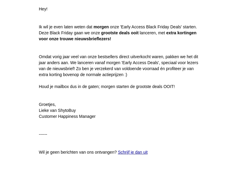 Morgen starten we met onze 'Early Access Black Friday Deals'. De grootste deals ooit met extra kortingen speciaal voor onze trouwe nieuwsbrieflezers! Zorg dat je er snel bij bent om van de beste aanbiedingen te profiteren. Na onze succesvolle campagnes vorig jaar, zorgen we dit jaar voor voldoende voorraad. Mis het niet en houd je mailbox in de gaten!