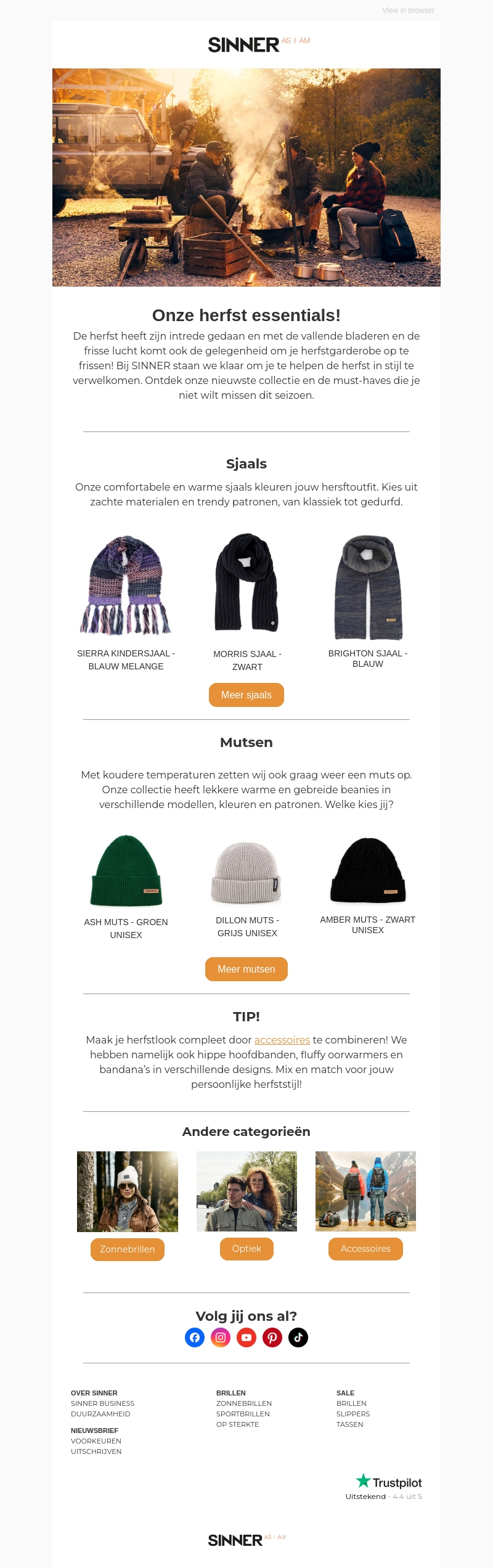 De herfst is gearriveerd en SINNER helpt je om in stijl van het seizoen te genieten. Ontdek comfortabele sjaals en mutsen in diverse kleuren en patronen. Bereid je voor op koudere dagen met accessoires die perfect bij jouw herfstoutfit passen. Laat je inspireren door onze tips en maak je look helemaal compleet. Vergeet niet onze andere categorieรซn zoals zonnebrillen en optiek te verkennen voor een volledige herfstervaring.