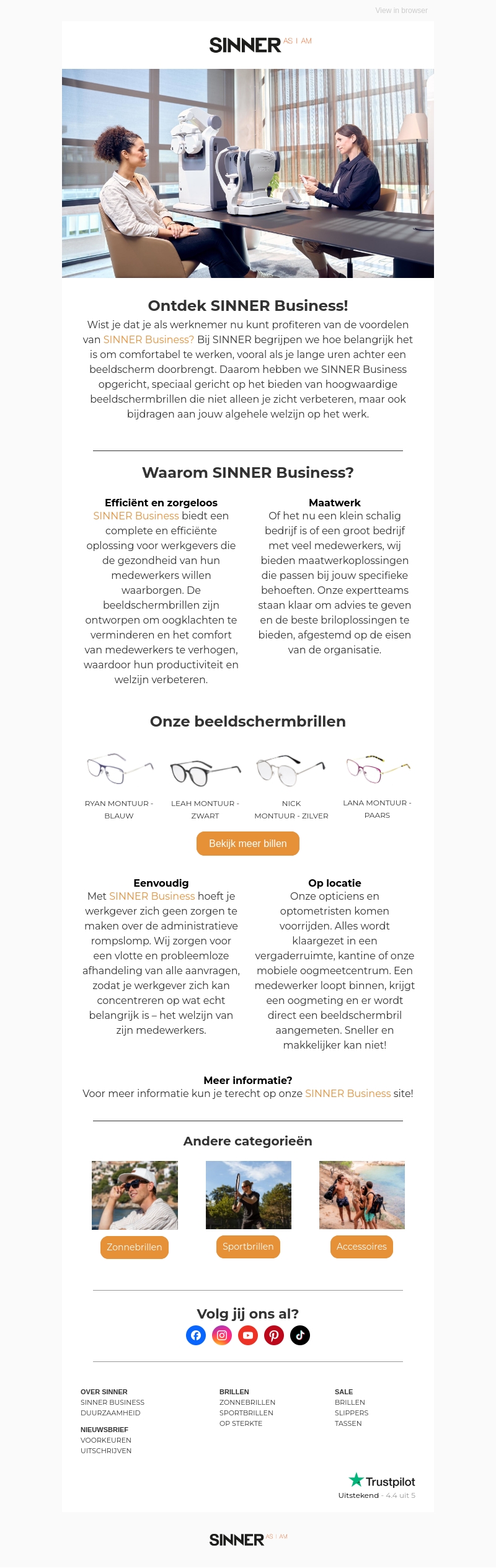 Bij SINNER Business begrijpen we het belang van comfort en gezondheid op het werk. Ontdek onze hoogwaardige beeldschermbrillen die niet alleen je zicht verbeteren, maar ook bijdragen aan jouw algehele welzijn. Bekijk ons aanbod en profiteer van maatwerkoplossingen die passen bij jouw specifieke behoeften.
