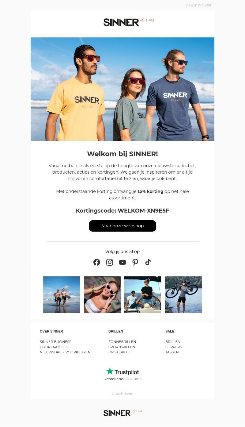 Welkom bij Sinner! We houden je graag op de hoogte van onze nieuwste collecties, producten, acties en kortingen. Ontvang nu 15% korting op ons gehele assortiment met de kortingscode WELKOM-XN9E5F. Bezoek onze webshop en ontdek stijlvolle en comfortabele mode, waar je ook bent.