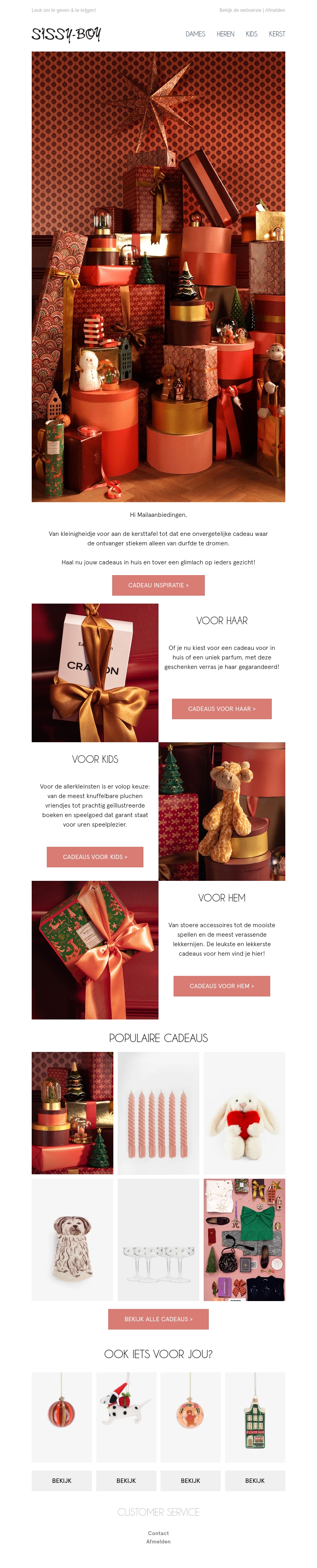 Ontdek de ultieme decembercadeaus bij Sissy-Boy. Of je nu op zoek bent naar trendy accessoires voor hem, een uniek parfum voor haar of leuke speeltjes voor de kids, er is voor ieder wat wils. Laat je inspireren door de stijlvolle presentatie van cadeau-ideeën die een glimlach op ieder gezicht toveren.