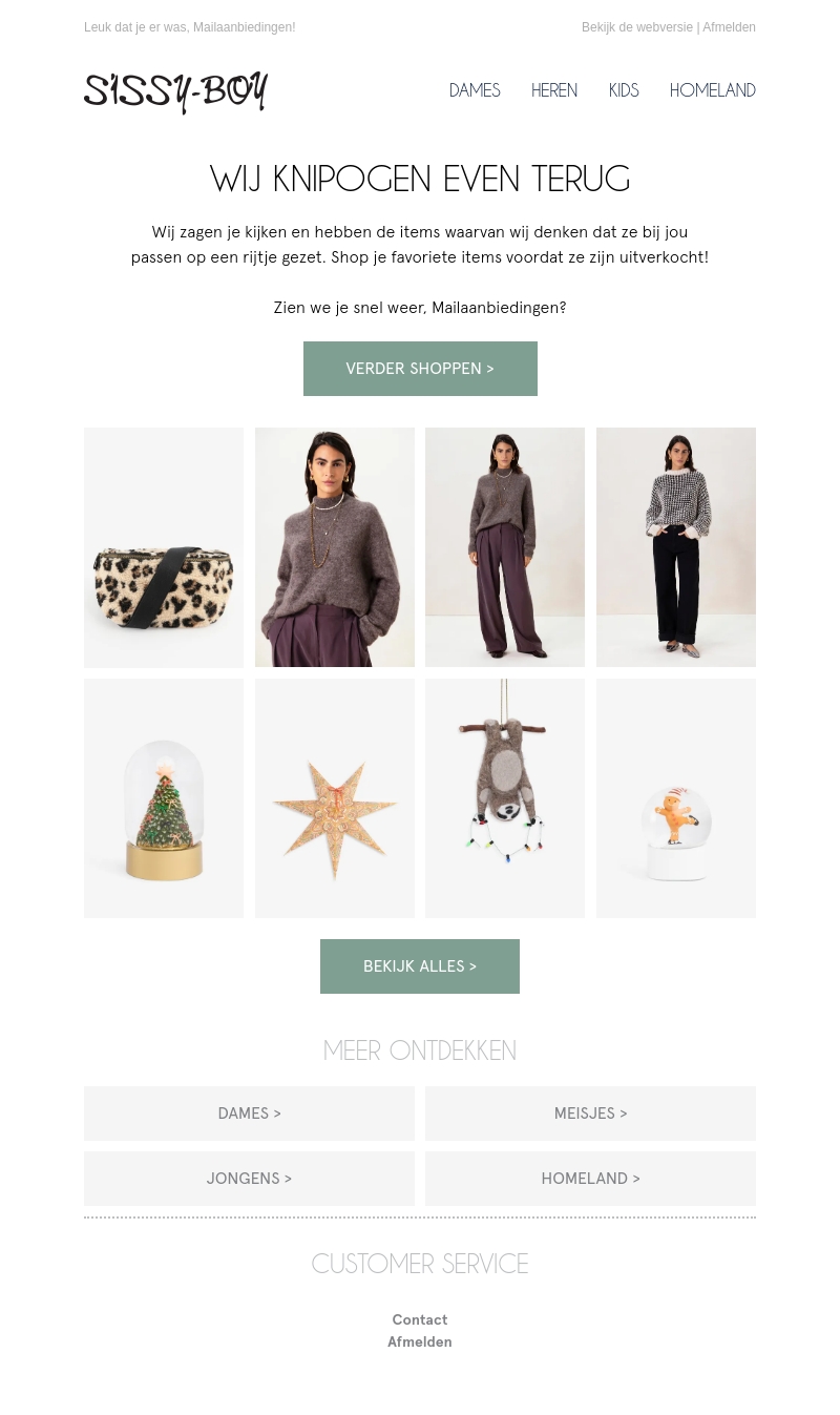 Mis geen kans op de speciale selectie van Sissy-Boy. Onze stylisten hebben een prachtige reeks items voor jou samengesteld. Tijd om je garderobe en huis op te frissen met deze unieke stukken. Shop nu je favorieten voordat ze uitverkocht zijn. Bekijk ook onze speciale collecties voor dames, heren, en kinderen.