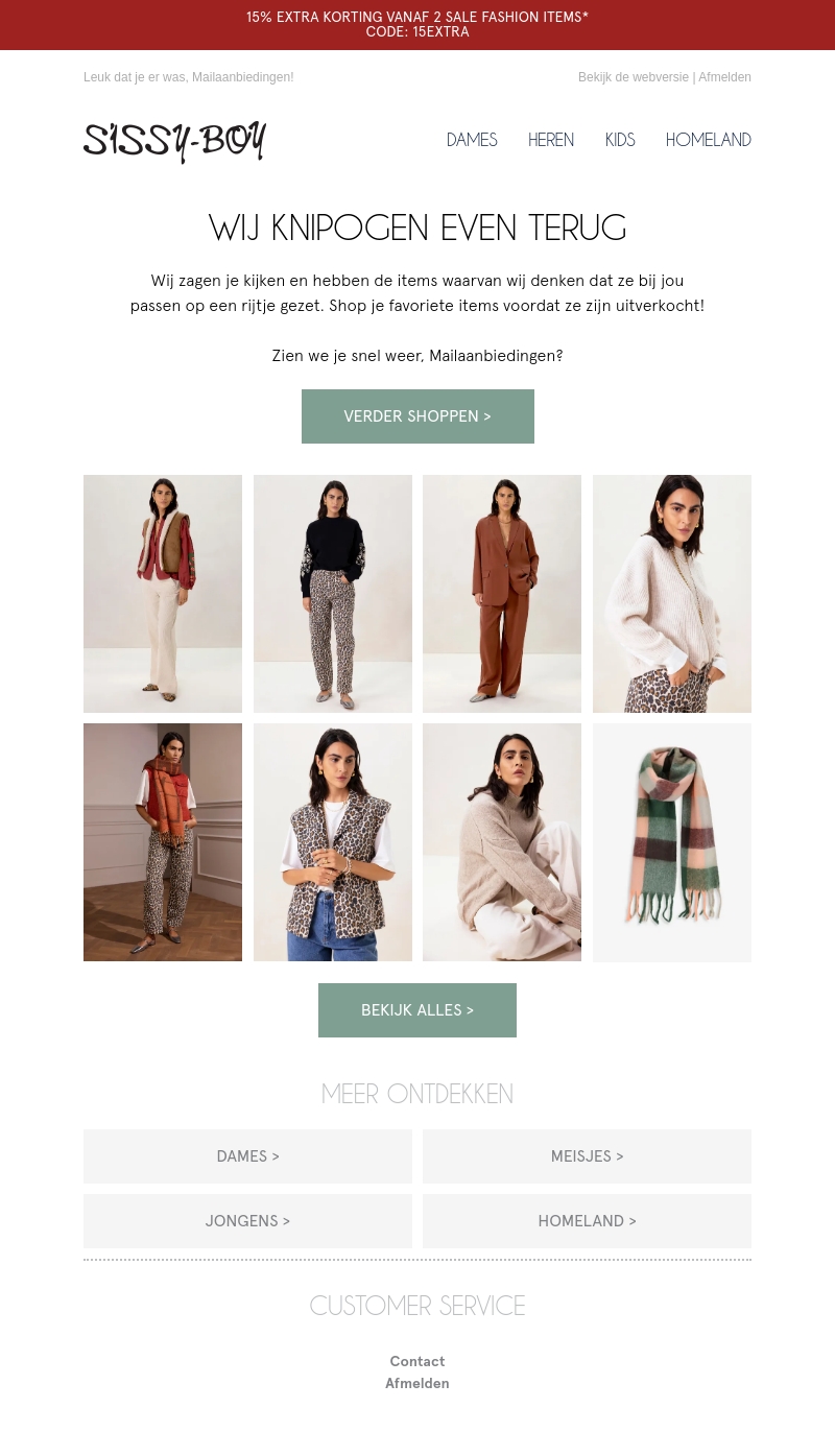 Verken de nieuwste fashion items bij Sissy-Boy en profiteer van een extra 15% korting bij aankoop van twee sale items. Ontdek stijlvolle outfits voor dames, heren, en kinderen. Shop je favorieten voordat ze uitverkocht zijn. Blijf stijlvol met Sissy-Boy!