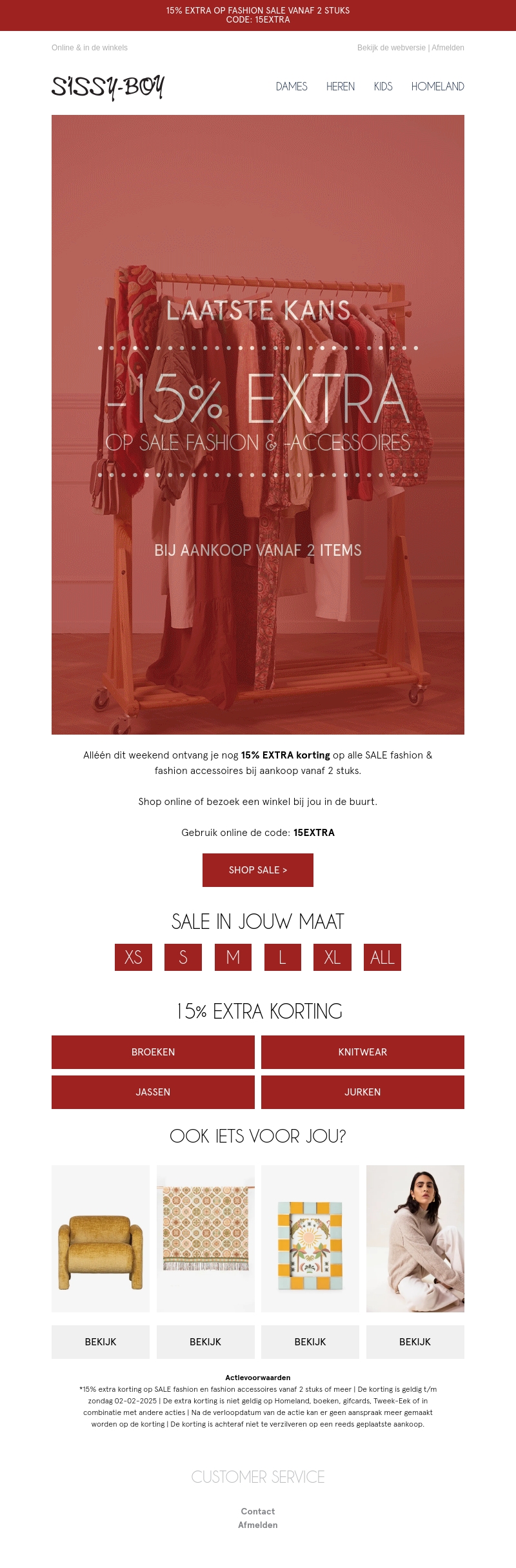 Mis deze unieke kans niet om 15% extra korting te krijgen op sale fashion en accessoires. Bij aankoop van minimaal twee items geniet je van extra voordeel. Geldig in de winkel en online. Gebruik de code 15EXTRA voor deze speciale aanbieding. Ontdek de nieuwste trends met geweldige kortingen die alleen dit weekend beschikbaar zijn.