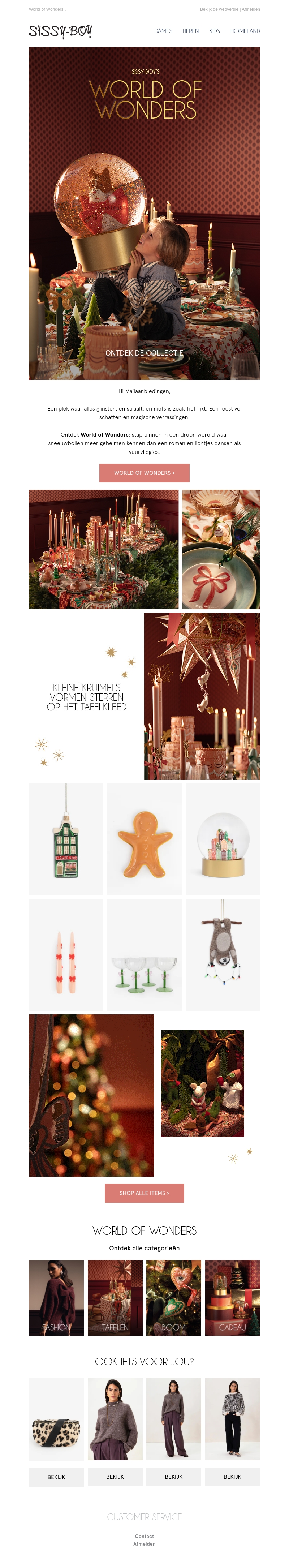 Betreed Sissy-Boy's 'World of Wonders' en ontdek de nieuwste kerstcollectie. Met glinsterende decoraties en feestelijke elementen transformeert u uw ruimte in een betoverend wonderland. Laat u inspireren door unieke tafeldecoraties en stijlvolle accessoires voor een onvergetelijke kerst.
