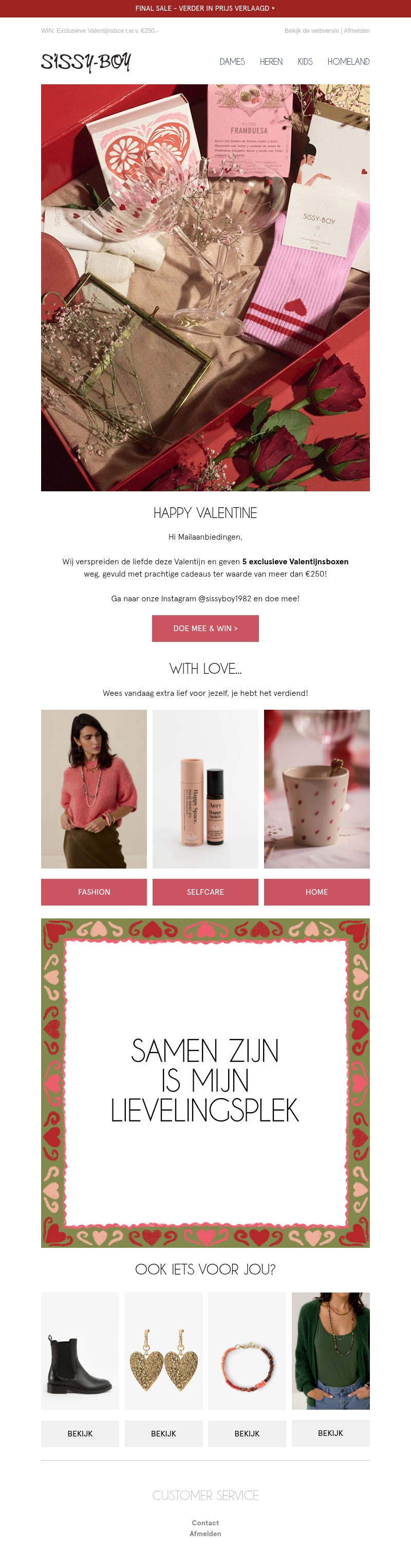 Verspreid de liefde met Sissy-Boy deze Valentijn. Ontdek onze exclusieve Valentijnsboxen vol prachtige cadeaus ter waarde van meer dan €250! Doe mee aan de winactie via onze Instagram en verwen jezelf met onze modieuze, zelfzorg en woonproducten. Samen zijn is het mooiste wat er is. Mis deze kans niet!