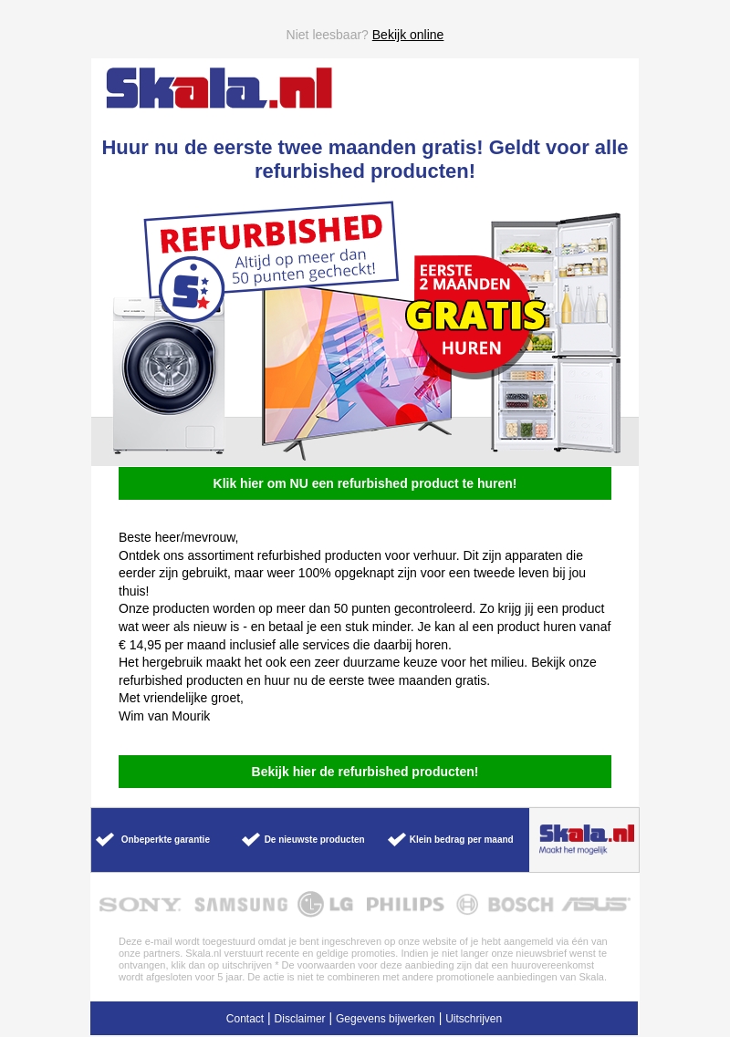 Beste heer/mevrouw, ontdek ons assortiment refurbished producten voor verhuur. Dit zijn apparaten die eerder zijn gebruikt, maar weer op 100% kwaliteit zijn gebracht. Huur nu jouw favoriete product en profiteer van twee maanden gratis huur!