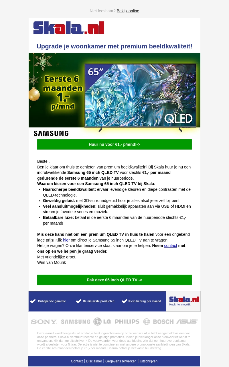 Upgrade je kijkervaring met de Samsung 65-inch QLED TV van Skala. Voor de eerste zes maanden betaal je maar €1 per maand. Geniet van haarscherpe beeldkwaliteit en indrukwekkend surroundgeluid. Mis deze kans niet om premium beeldkwaliteit in huis te halen tegen een onverslaanbare prijs.