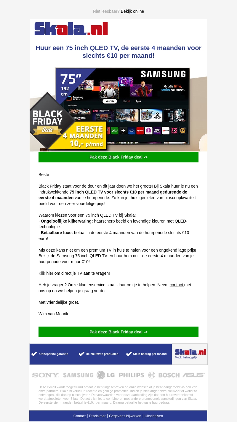 Profiteer van een indrukwekkende Black Friday deal bij Skala. Huur een 75 inch Samsung QLED TV voor een ongekend lage prijs van slechts €10 per maand gedurende de eerste 4 maanden. Geniet thuis van bioscoopkwaliteit beeld en levendige kleuren. Mis deze kans niet, vraag snel aan!
