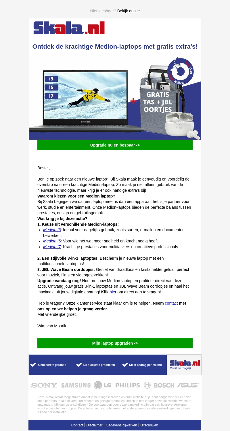Ontdek de nieuwste Medion-laptops bij Skala en upgrade jouw digitale ervaring. Profiteer van een breed scala aan modellen, inclusief de i3, i5, en i7, perfect voor zowel dagelijks gebruik als professioneel werk. Naast de nieuwste technologie ontvang je een gratis 3-in-1 laptoptas en JBL Wave Beam oordopjes voor een complete multimedia-ervaring. Upgrade vandaag en geniet van deze exclusieve aanbiedingen.