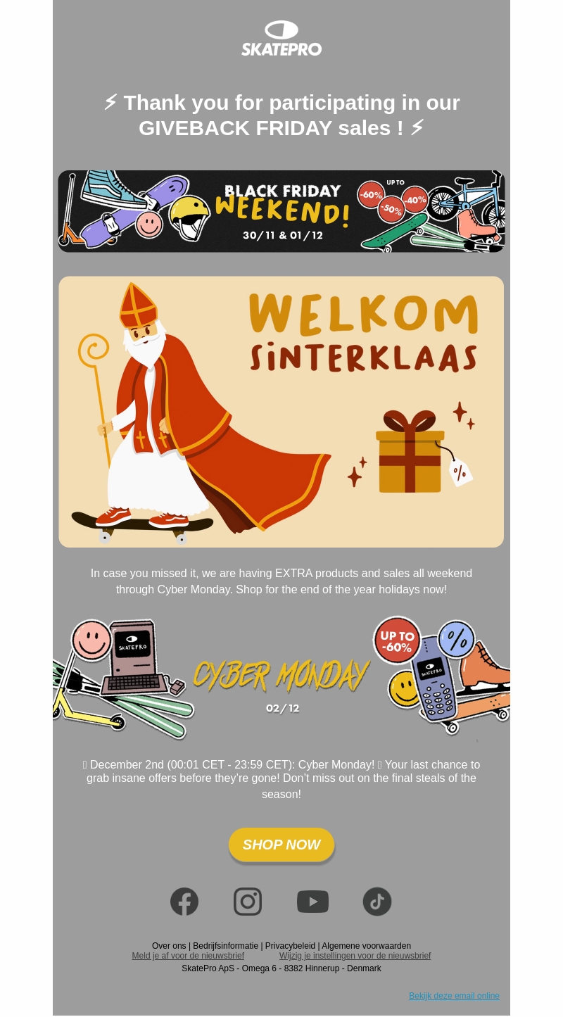 Het is tijd om te profiteren van geweldige kortingen tijdens ons Black Friday Weekend op 30/11 en 01/12 en vervolgens onze Cyber Monday deals op 02/12. Bereid je voor op fantastische kortingen tot wel 60%! Vergeet ook niet Sinterklaas te verwelkomen met speciale aanbiedingen. Shop nu en mis deze geweldige kans niet!