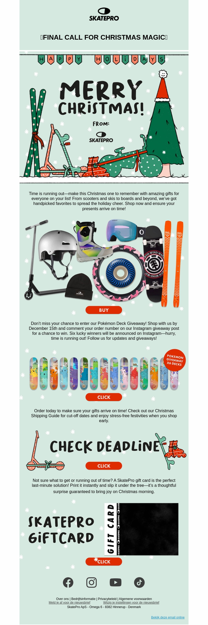 De tijd dringt! Maak deze Kerst onvergetelijk met geweldige cadeaus van SkatePro. Van scooters tot ski's en meer, wij hebben de beste keuze voor iedereen. Doe mee aan onze Pokémon Deck Giveaway en houd onze Instagram in de gaten voor updates. Geef gemak met een SkatePro cadeaubon!