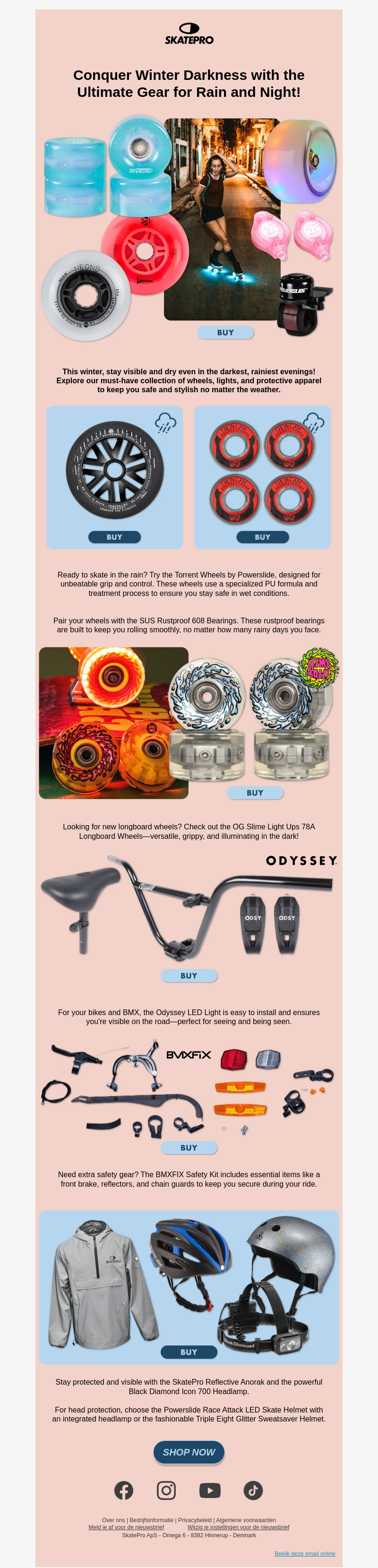 Bereid je voor op de winter met onze ultieme uitrusting voor regen en nacht. Ontdek robuuste wielen voor all-weather skateboarden en beschermende kleding om stijlvol en veilig te blijven. Of je nu door regen of in het donker skatet, onze producten zorgen ervoor dat je zichtbaar en beschermd bent.