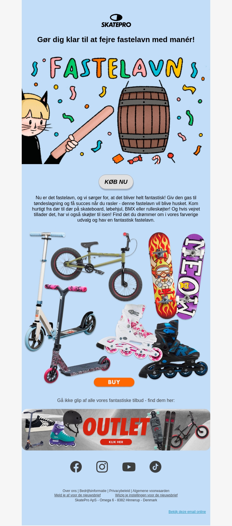 Fastelavn komt eraan en SkatePro zorgt voor een spectaculaire viering! Met een breed aanbod aan skateboards, steppen, en schaatsen, ben je klaar om deze feestdag in stijl te beleven. Mis de kans niet om je favoriete actie-sportuitrusting tegen geweldige prijzen te scoren. Of het nu gaat om skateboarden, skeeleren of schaatsen, we hebben alles wat je nodig hebt. Ga zeker langs bij onze OUTLET voor nog meer fantastische kortingen.