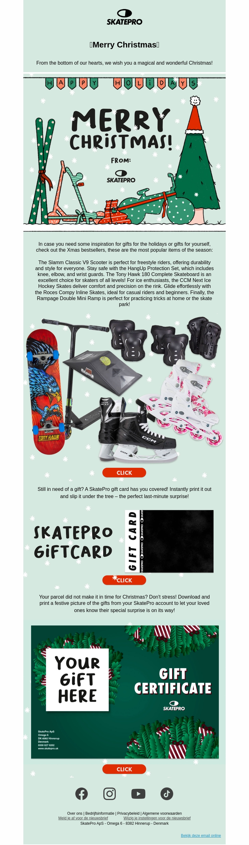 Beleef een magische kerst met SkatePro! Van de perfecte scooter tot stijlvolle schaatsen, wij hebben de beste geschenken voor iedere liefhebber. Nog geen cadeau? Onze giftcards zijn een geweldige last-minute oplossing. Mis het niet en maak deze kerst onvergetelijk!