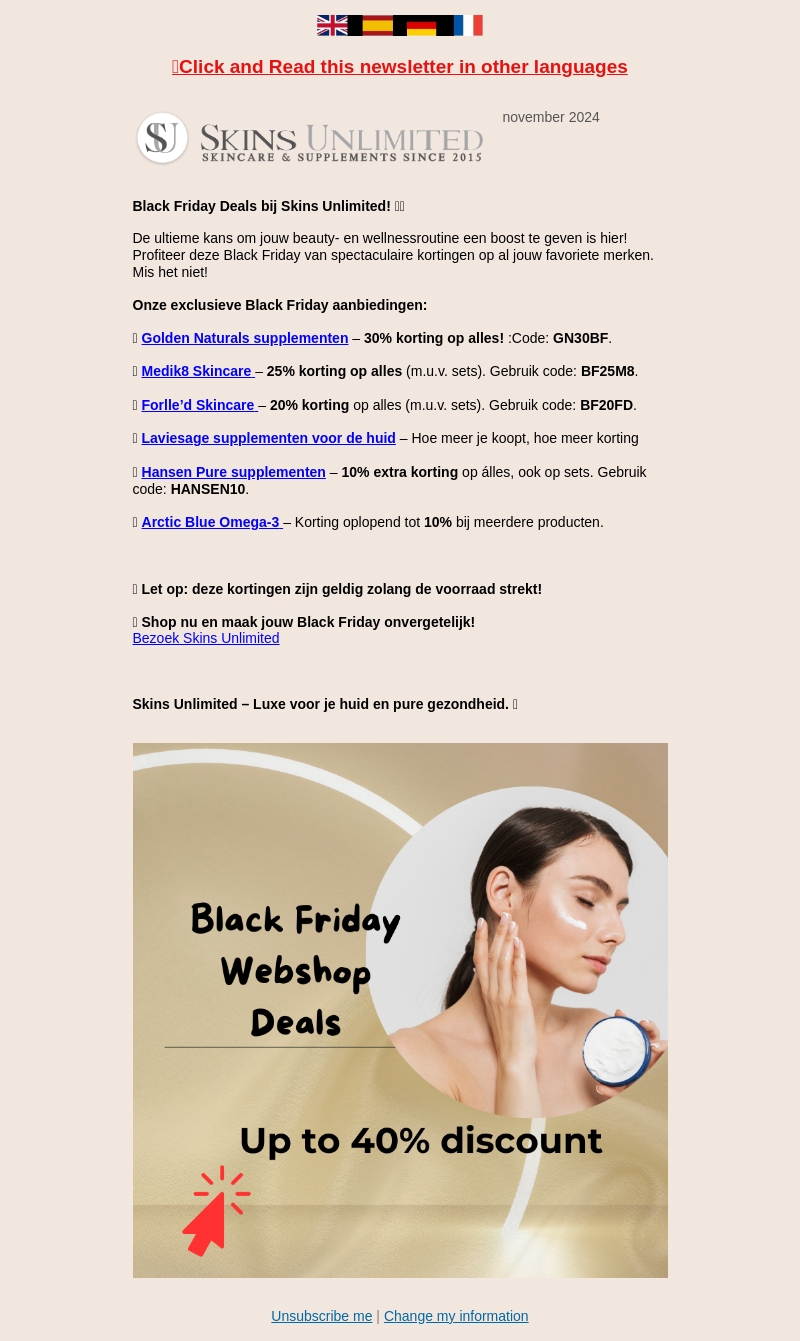 Skins Unlimited biedt deze Black Friday spectaculaire kortingen op hun uitgebreide assortiment van beauty- en wellnessproducten. Zorg goed voor jezelf en je portemonnee met kortingen tot 40%! Mis de kans niet om luxe producten tegen gereduceerde prijzen te scoren. Bekijk nu onze exclusieve aanbiedingen en claim je kortingen voordat ze weg zijn. Maak je Black Friday onvergetelijk met Skins Unlimited.
