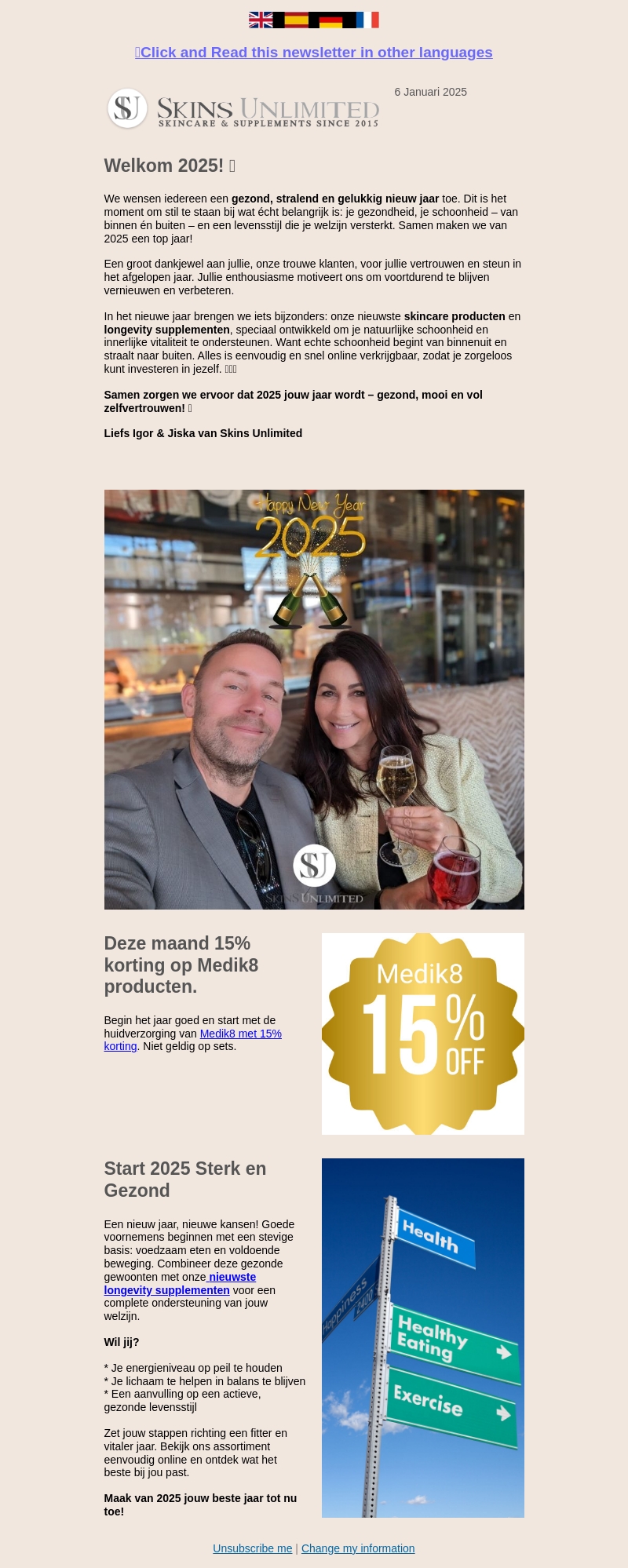 Vier het nieuwe jaar met Skins Unlimited’s speciale kortingen en innovatieve producten. Ontdek onze focus op gezondheid en schoonheid, van binnen en buiten. Profiteer van 15% korting op Medik8 producten. Start 2025 met onze nieuwste longevity supplementen voor een vitaal jaar vol zelfvertrouwen.