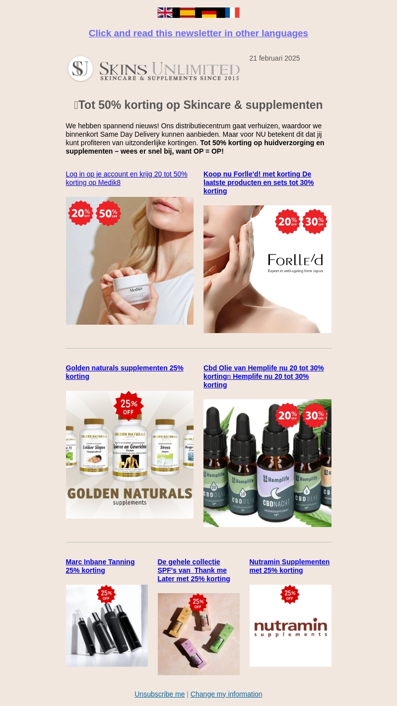 Ontvang tot 50% korting op huidverzorging en supplementen bij Skins Unlimited. Onze verhuisactie biedt unieke kortingen. Wees er snel bij want OP = OP! Log in op je account voor extra voordelen en ontdek de nieuwste producten met kortingen tot wel 30%.