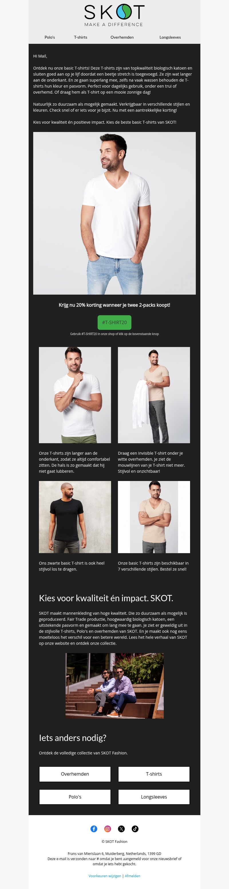 Ontdek de nieuwste basic T-shirts van SKOT. Gemaakt van topkwaliteit biologisch katoen. Verkrijgbaar in verschillende stijlen en kleuren. Nu met 20% korting bij aankoop van twee 2-packs. Deze T-shirts zijn perfect voor dagelijks gebruik. Kies voor kwaliteit en positieve impact.