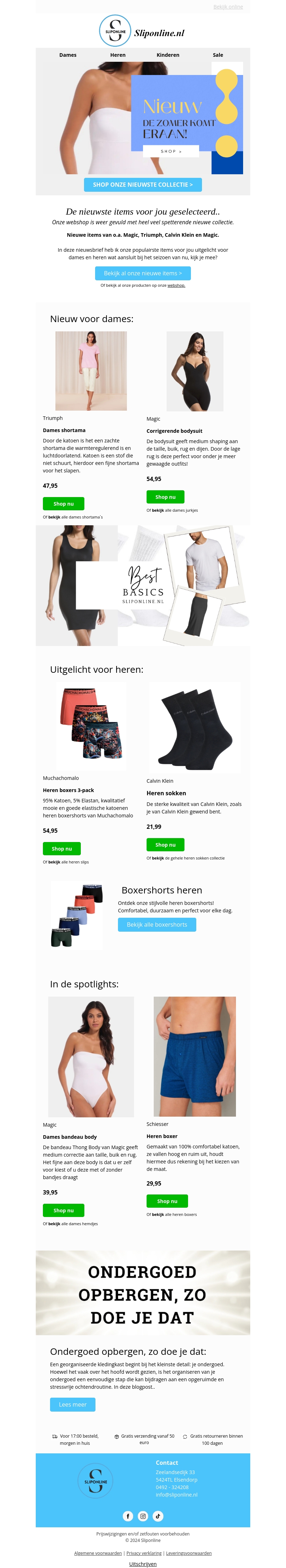 Bereid je voor op de zomer met de nieuwste collectie van Sliponline.nl! Van damesshortama's tot herensokken, we hebben alles wat je nodig hebt voor een comfortabele zomer. Mis onze selectie van Magic, Triumph, en Calvin Klein niet. Ontdek ook onze handige tips voor het opbergen van ondergoed.