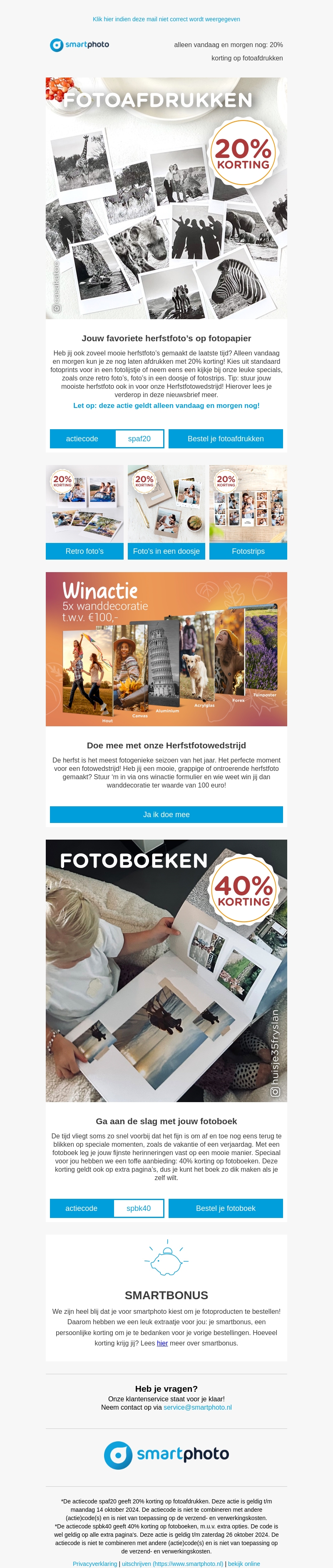 Ontdek een geweldige aanbieding van Smartphoto met 20% korting op fotoafdrukken, geldig tot morgen. CreΓ«er prachtige herfstoffoto's op fotopapier of maak een fotoboek met 40% korting voor speciale momenten. Doe ook mee met de herfstfotowedstrijd en maak kans op een waardebon voor wanddecoratie. Mis deze korte actie niet en bestel jouw favoriete fotoproducten nu!