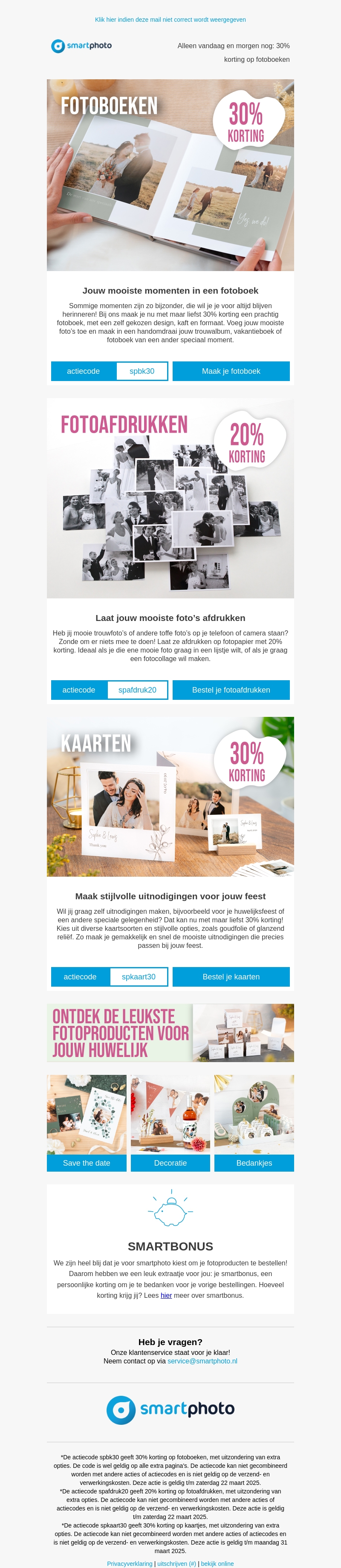 Ontdek met Smartphoto de magie van je mooiste momenten in een fotoboek, met een exclusieve 30% korting. Van bruiloftfotografie tot vakantieherinneringen, vang elk speciaal moment in een prachtig gepersonaliseerd fotoboek. Haast je, want deze aanbieding geldt alleen vandaag en morgen. Ontwerp eenvoudig je fotoboek en leg je herinneringen vast zoals jij dat wilt. Mis deze kans niet om iets bijzonders te creΓ«ren!