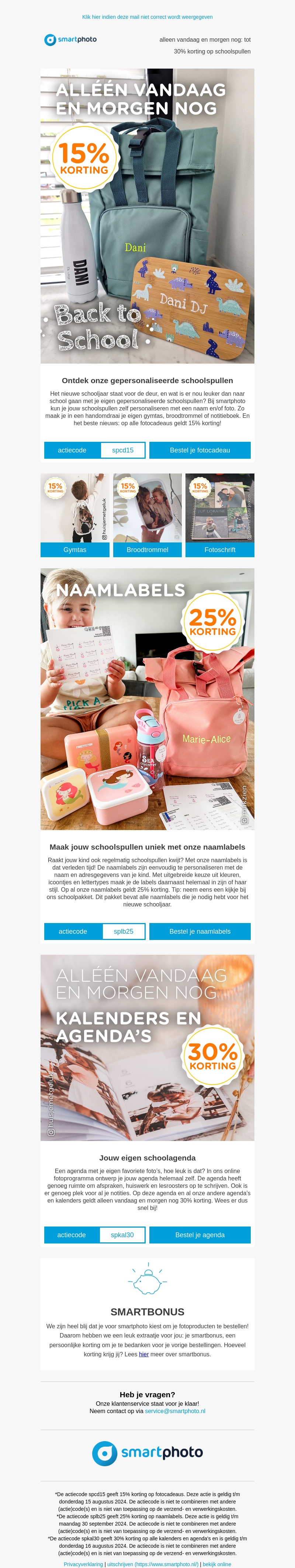 Profiteer nu van tot wel 30% korting op diverse gepersonaliseerde schoolspullen bij smartphoto. De actie geldt alleen vandaag en morgen, dus wees er snel bij! Van tassen en lunchboxen tot naamlabels en agenda's, vind alles wat je nodig hebt voor het nieuwe schooljaar.
