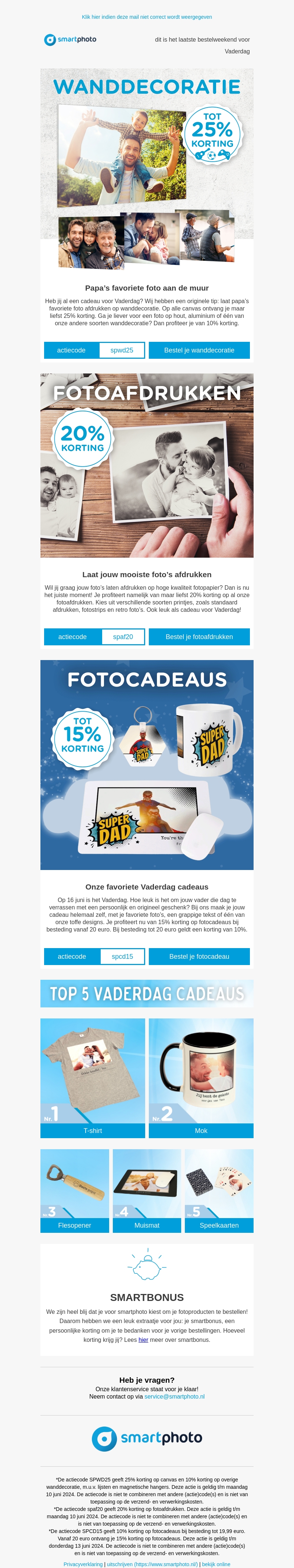 Dit is je laatste kans om het perfecte cadeau voor Vaderdag te bestellen! Geniet van aantrekkelijke kortingen tot 25% op wanddecoratie, 20% op fotoafdrukken, en 15% op fotocadeaus bij Smartphoto. Mis het niet!