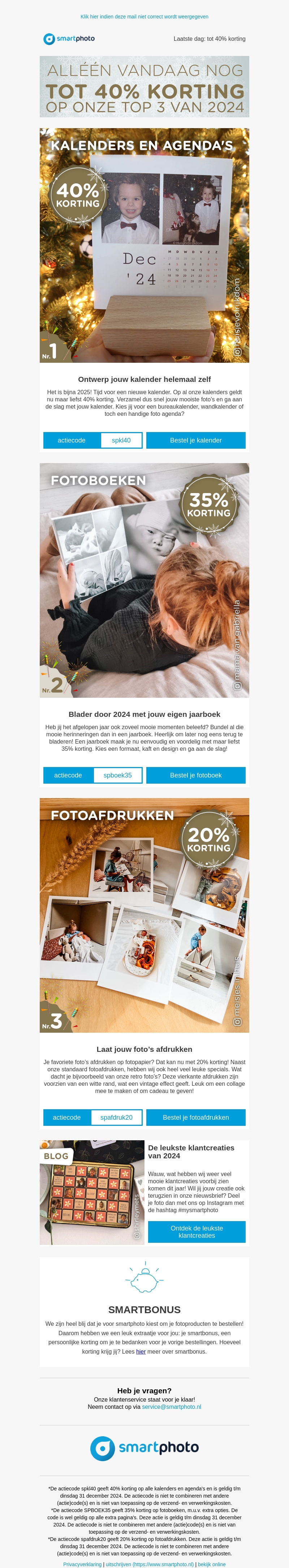 Mis de laatste dag niet om te profiteren van tot 40% korting op geselecteerde fotoproducten. Ontwerp je eigen kalender, blader door een persoonlijk fotoboek of laat je mooiste herinneringen afdrukken. Er zijn speciale kortingscodes beschikbaar voor extra voordeel. Bezoek ons vandaag nog!