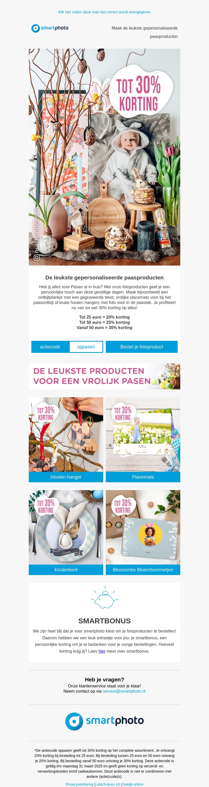 Verras je familie en vrienden deze Pasen met gepersonaliseerde producten. Van houten hangers tot unieke placemats, voeg een persoonlijke touch toe aan de feestdagen. Geniet nu van kortingen tot 30% op je aankoop!