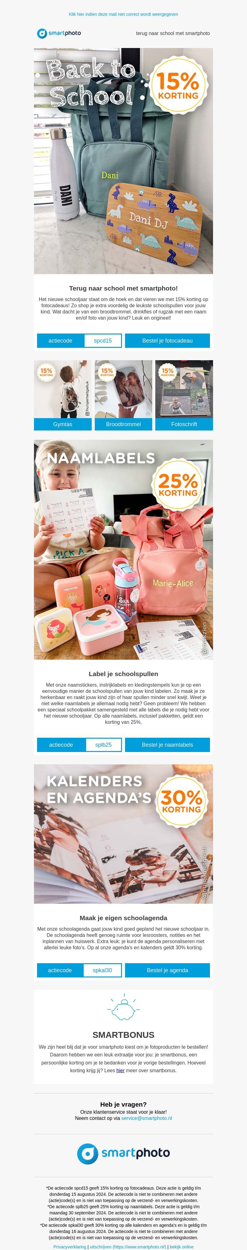 Ga voorbereid het nieuwe schooljaar in met de geweldige aanbiedingen van smartphoto! Geniet van 15% korting op fotocadeaus en maak je schoolspullen persoonlijker met naamlabels. Vergeet niet om jouw eigen schoolagenda te maken met 30% korting. Pak deze kansen voor een perfect begin van het schoolseizoen!