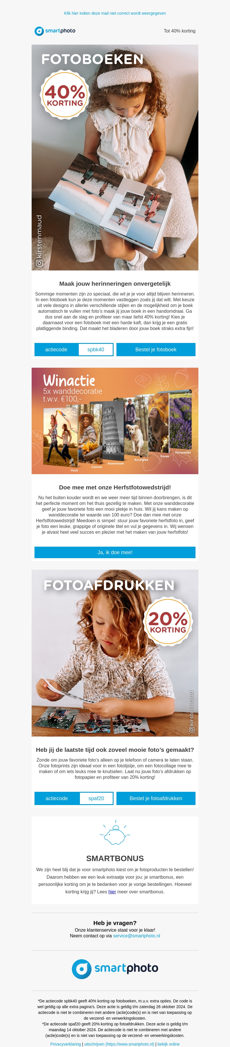 Smartphoto biedt nu tot 40% korting op fotoboeken en 20% korting op fotoafdrukken. Maak jouw herinneringen onvergetelijk door prachtige fotoboeken te creΓ«ren en je mooiste foto's af te drukken. Mis deze kans niet om te besparen en je creativiteit te tonen!