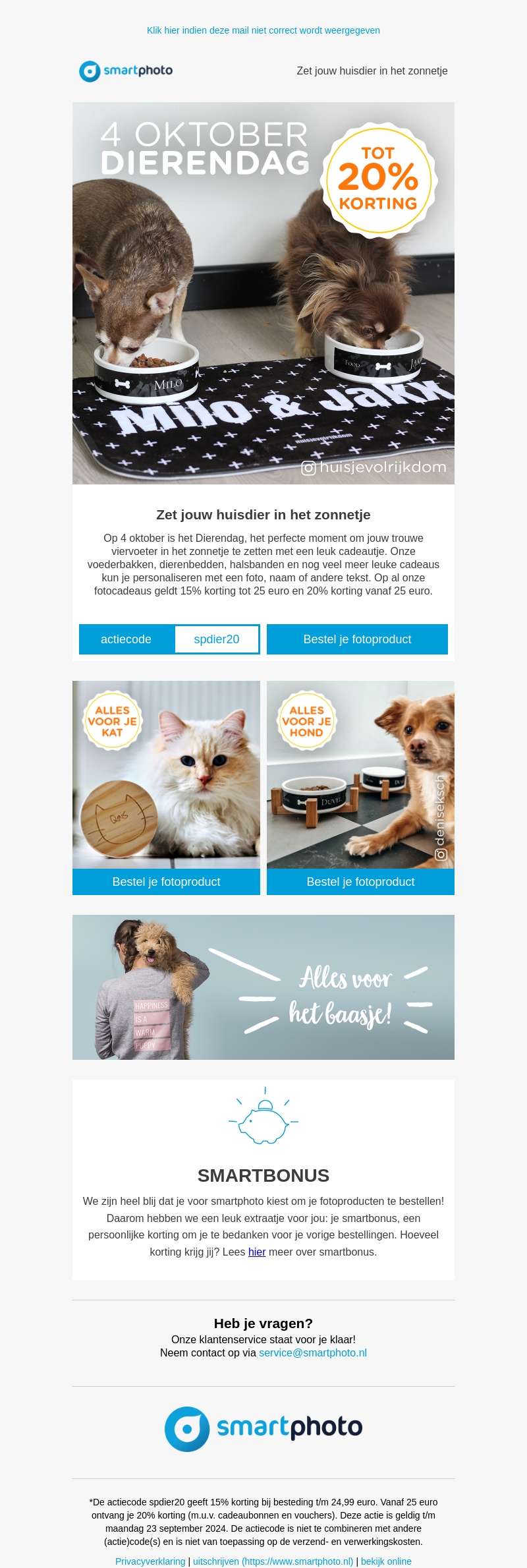 Op 4 oktober is het Dierendag! Een perfect moment om je huisdier te verwennen met leuke cadeaus. Profiteer van kortingen tot 20% op gepersonaliseerde voerbakken, dierenbedden en meer!