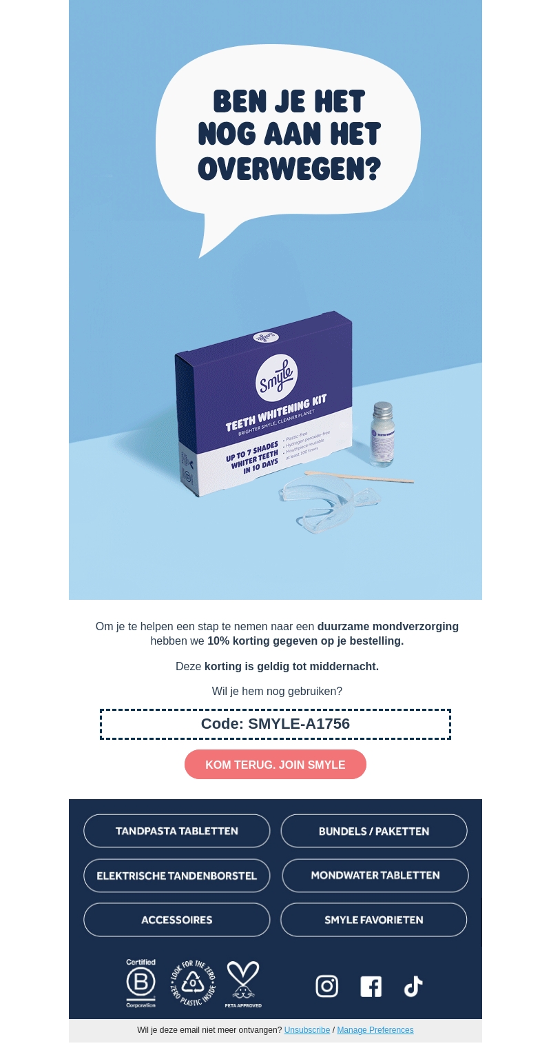 Overweeg je nog steeds om duurzamer te leven? Grijp deze kans en ontvang 10% korting op je bestelling voor duurzame mondverzorgingsproducten van Smyle. Deze korting is geldig tot middernacht. Gebruik de couponcode SMYLE-A1756 en verbeter je glimlach duurzaam.