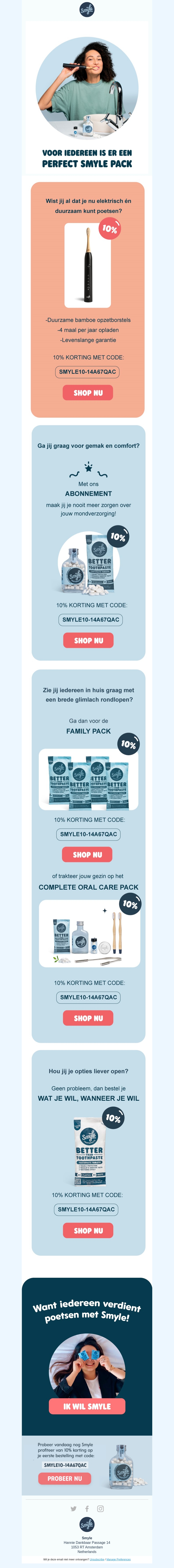 Er is een Smyle pack voor iedereen! Kies uit duurzame elektrische borstels, handige abonnementen, gezinsverpakkingen en complete verzorgingspakketten. Profiteer nu van 10% korting met de code SMYLE10-14A67QAC en vind jouw ideale Smyle pack.